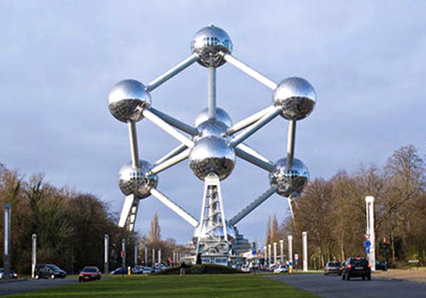 L'Atomium est de 102 mètres de haut. Il se compose d'une charpente d'acier portant neuf sphères reliées entre elles et habillées d'aluminium. Son acier de construction pèse 2 400 tonnes. Il est devenu, au même titre que le Manneken Pis et la Grand-Place, le symbole de la capitale de la Belgique.