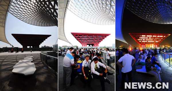 Montage de photos du pavillon de la Chine prises le 5 juin 2010 à différents moments: le matin à l'ouverture, le midi et le soir (de gauche à droite), dans le parc de l'Exposition universelle de Shanghai. Le nombre de visiteurs de l'Exposition a dépassé 10 millions depuis son ouverture officielle le 1er mai, a annoncé dimanche ses organisateurs. Le nombre quotidien de visiteurs a établi un nouveau record, samedi, à 520 000 personnes.