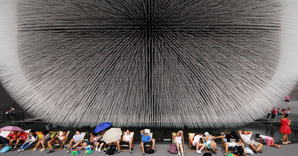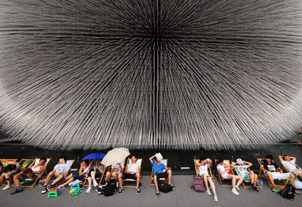 Des visiteurs se reposent sur des chaises longues conçues par de célèbres designers britanniques et chinois et installées récemment à côté du pavillon du Royaume-Uni dans le Parc de l'Exposition universelle de Shanghai, le 6 août 2010.