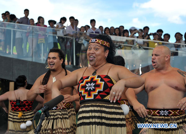Des artistes interprètent le haka, danse traditionnelle néo-zélandaise, dans le parc de l'Exposition universelle de Shanghai, le 7 août.