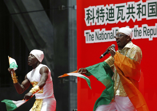 Artistes ivoiriens lors d'une cérémonie marquant la Journée du pavillon de la République de Côte d'Ivoire à l'Exposition universelle de Shanghai 2010, le 8 août 2010.