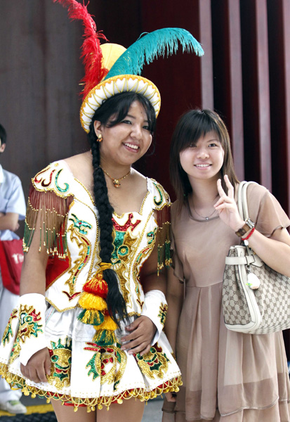 Une visiteuse et une jeune fille bolivienne en costume traditionnel lors d'une cérémonie pour la journée nationale du pavillon de la Bolivie à l'Exposition universelle de Shanghai 2010, le 13 août 2010.