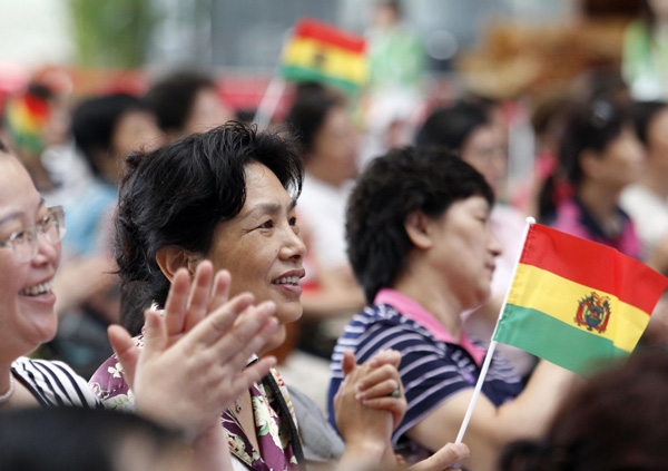 Des spectateurs lors d'une cérémonie pour la journée nationale du pavillon de la Bolivie à l'Exposition universelle de Shanghai 2010, le 13 août 2010.
