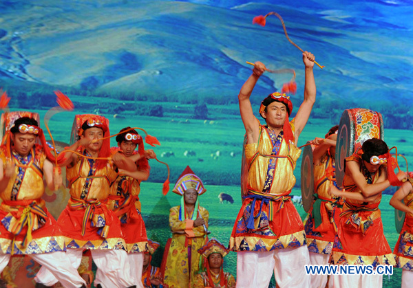 Des danseurs lors de la cérémonie d'ouverture de la Semaine du Tibet au parc de l'Exposition universelle à Shanghai, le 1er septembre 2010. Plus de 400 artistes en provenance de la région autonome du Tibet (sud-ouest de la Chine) participeront à des activités variées durant la Semaine du Tibet à l'Exposition universelle 2010 de Shanghai du 1er au 5 septembre.