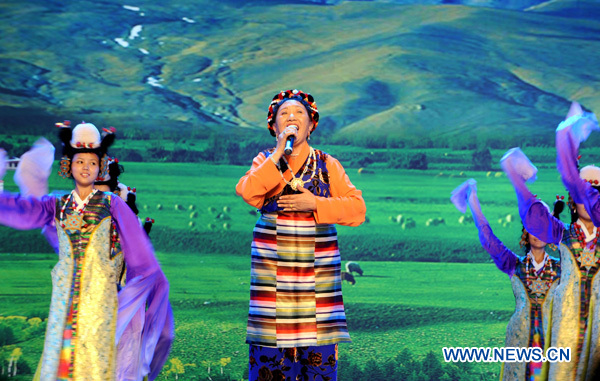 Cedain Zhoema, une célèbre chanteuse tibétaine, lors de la cérémonie d'ouverture de la Semaine du Tibet au parc de l'Exposition universelle à Shanghai, le 1er septembre 2010. Plus de 400 artistes en provenance de la région autonome du Tibet (sud-ouest de la Chine) participeront à des activités variées durant la Semaine du Tibet à l'Exposition universelle 2010 de Shanghai du 1er au 5 septembre.