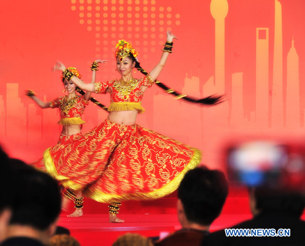 Danseuses chinoises lors d'une cérémonie marquant la journée d'honneur du Forum de Boao pour l'Asie, à l'Exposition universelle de Shanghai, le 9 septembre 2010. Yasuo Fukuda (non sur la photo), ancien Premier ministre japonais et président du conseil exécutif de ce forum, a participé jeudi à la cérémonie.