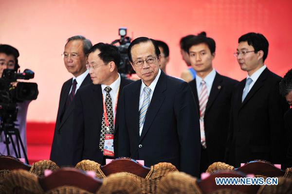 Yasuo Fukuda (au centre), ancien Premier ministre japonais et président du conseil exécutif du Forum de Boao pour l'Asie, lors d'une cérémonie marquant la journée d'honneur de ce forum, à l'Exposition universelle de Shanghai, le 9 septembre 2010.
