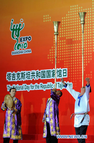 Artistes tadjiks lors d'une cérémonie pour la Journée nationale du pavillon du Tadjikistan à l'Exposition universelle de Shanghai 2010, le 22 septembre 2010.