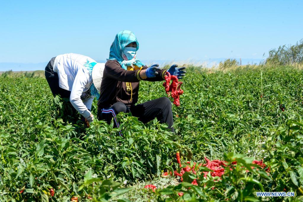 Des villageois cueillent des piments rouges dans le bourg de Santanghu du district autonome kazakh de Barkol, dans la région autonome ouïgoure du Xinjiang (nord-ouest de la Chine), le 19 août 2021. (Xinhua/Gao Han)
