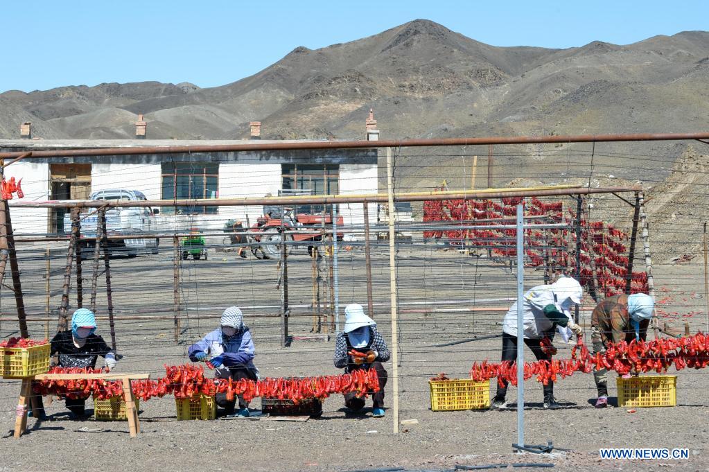Des villageois font sécher des piments rouges dans le bourg de Santanghu du district autonome kazakh de Barkol, dans la région autonome ouïgoure du Xinjiang (nord-ouest de la Chine), le 19 août 2021. (Xinhua/Gao Han)