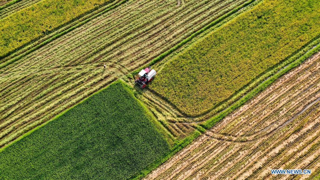 CHANGNING, 24 août (Xinhua) -- Photo aérienne prise le 23 août montrant des agriculteurs opérant des moissonneuses pour récolter du riz dans le village de Zhangtang, à Changning, dans la province chinoise du Hunan (centre). Ce lundi marquait la fin des grandes chaleurs de l'été (Chushu). Les chaudes journées d'été passeront après ce jour. (Photo : Zhou Xiuyuchun)