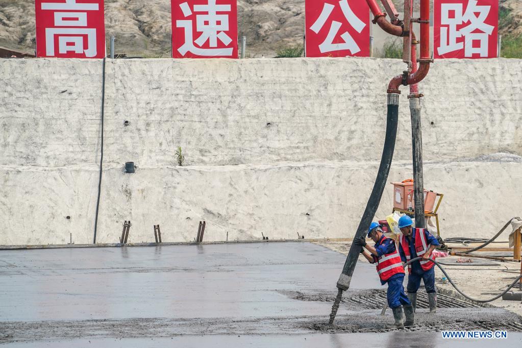 WUXI, Jiangsu, 6 septembre (Xinhua) -- Des ouvriers sur le chantier de la section de Nanquan du tunnel Taihu, à Wuxi, dans la province chinoise du Jiangsu (est), le 5 septembre 2021. Les principaux travaux de la section de Nanquan ont pris fin dimanche. Le tunnel Taihu (10,8 km de long, 43,6 m de large) fait partie de l'autoroute Changzhou-Wuxi (43,9 km) et passe sous le lac Taihu, le troisième plus grand lac d'eau douce dans le pays. (Photo : Li Bo)