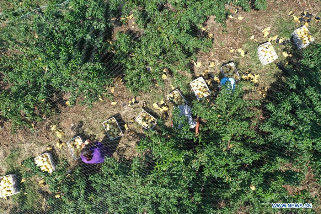BAOFENG, Henan, 9 septembre (Xinhua) -- Photo prise le 8 septembre 2021 d'agriculteurs récoltant des pêches fraîches dans le village de Jinli du district de Baofeng, dans la province chinoise du Henan (centre). (Photo : He Wuchang)
