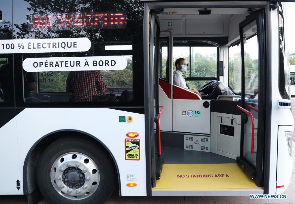 PARIS, 21 septembre (Xinhua) -- Un bus autonome fabriqué par l'entreprise chinoise CRRC Electric Vehicle mène des tests à Paris, en France, le 17 septembre 2021. Ce bus autonome de 12 mètres de long fabriqué par la CRRC a entamé des essais sur route à Paris ce week-end. (Photo : Gao Jing)