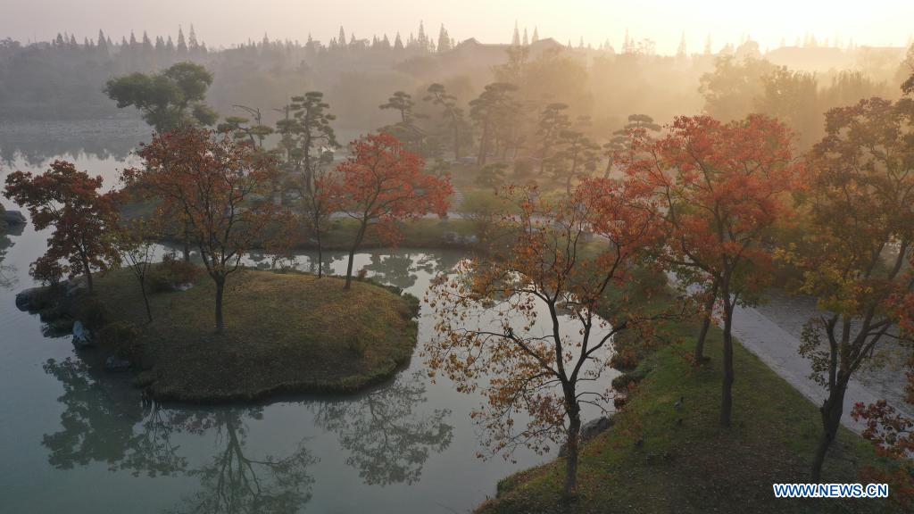 YANGZHOU, 1er novembre (Xinhua) -- Photo aérienne du paysage automnal du site pittoresque du lac mince de l'Ouest, à Yangzhou, dans la province chinoise du Jiangsu (est), le 31 octobre 2021. (Photo : Qi Liguang)
