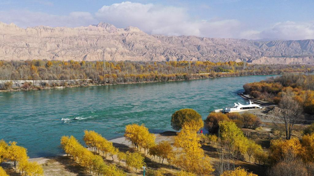 Vue aérienne du fleuve Jaune dans le district de Guide de la province chinoise du Qinghai (nord-ouest), le 28 octobre 2021. (Xinhua/Zhang Hongxiang)