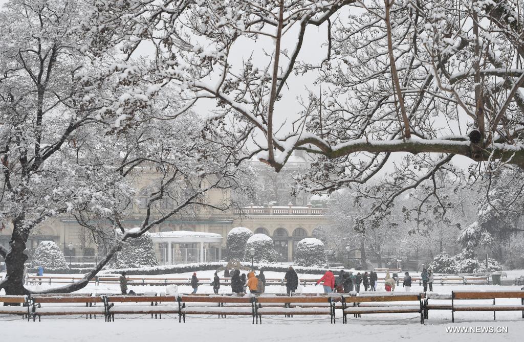 Des gens se promènent dans la neige au Stadtpark à Vienne, en Autriche, le 9 décembre 2021. (Xinhua/Guo Chen)