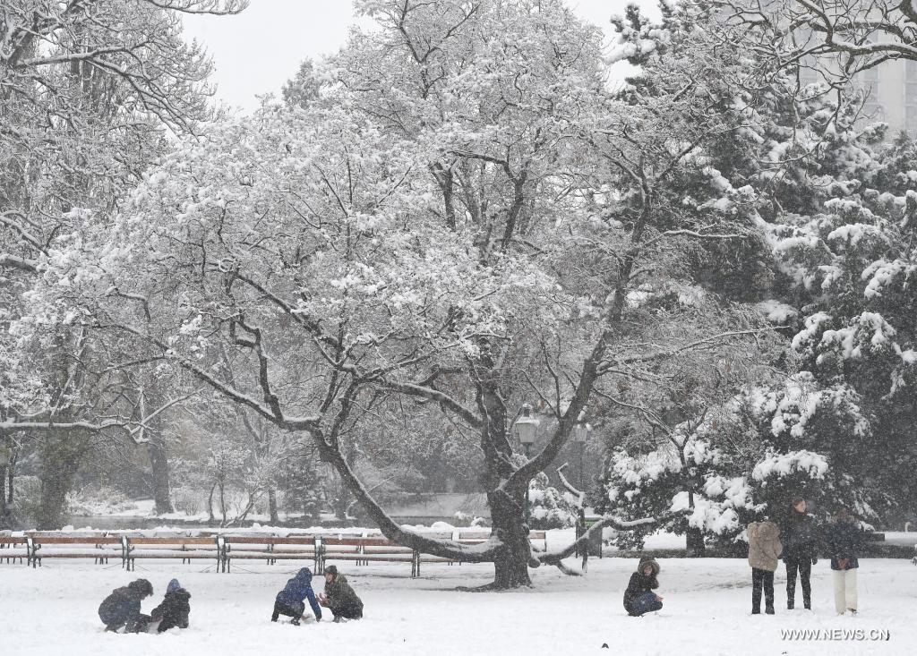 Des gens s'amusent dans la neige au Stadtpark à Vienne, en Autriche, le 9 décembre 2021. (Xinhua/Guo Chen)