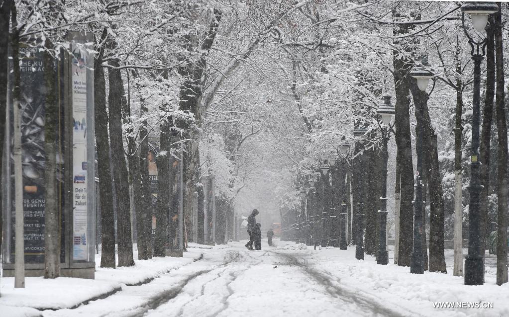 Des gens se promènent dans la neige à Vienne, en Autriche, le 9 décembre 2021. (Xinhua/Guo Chen)