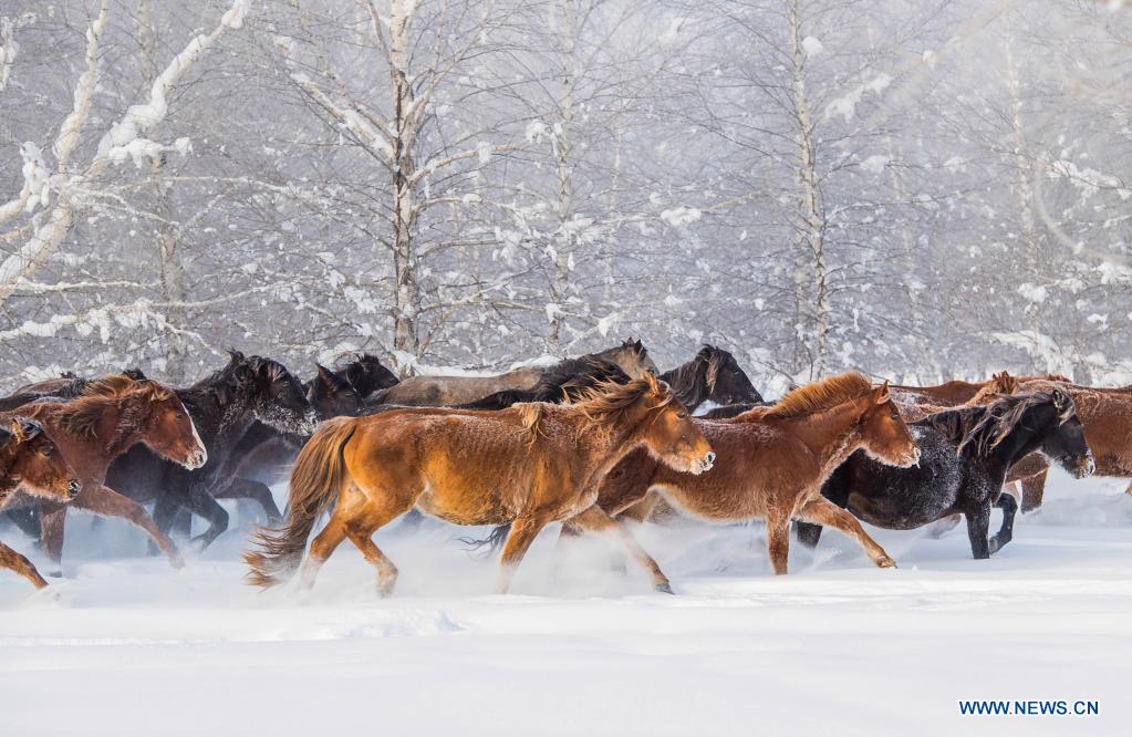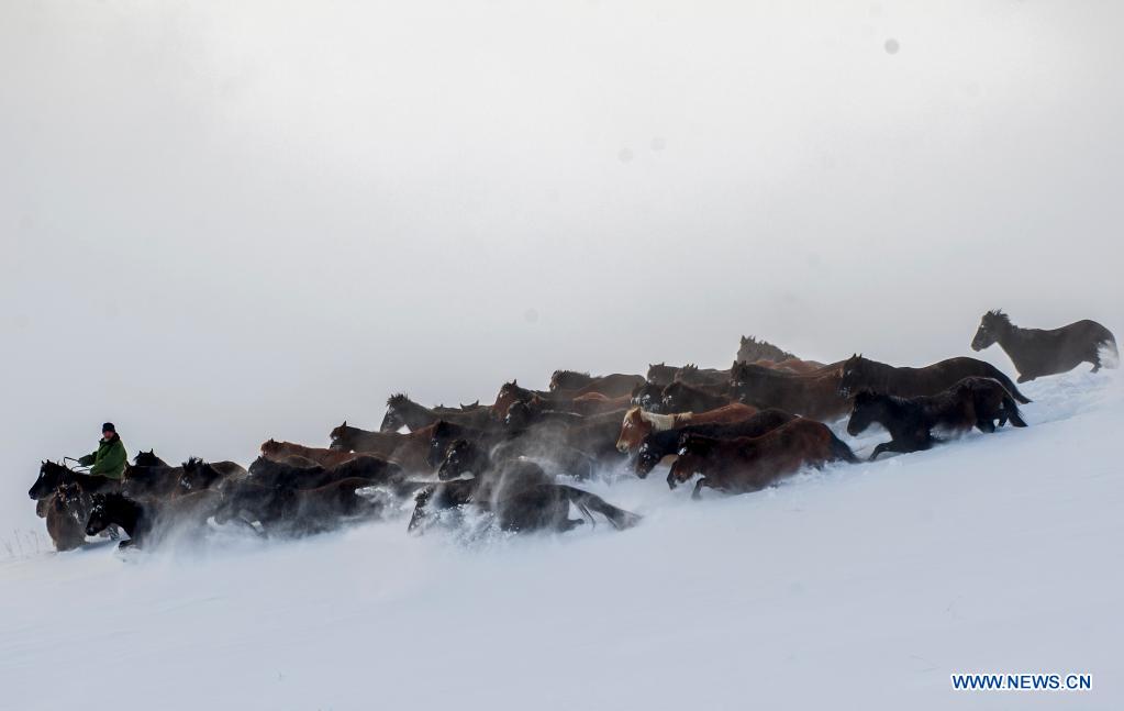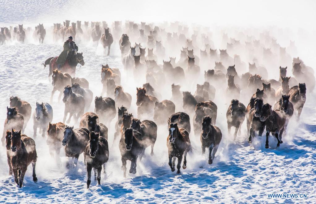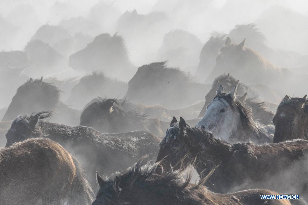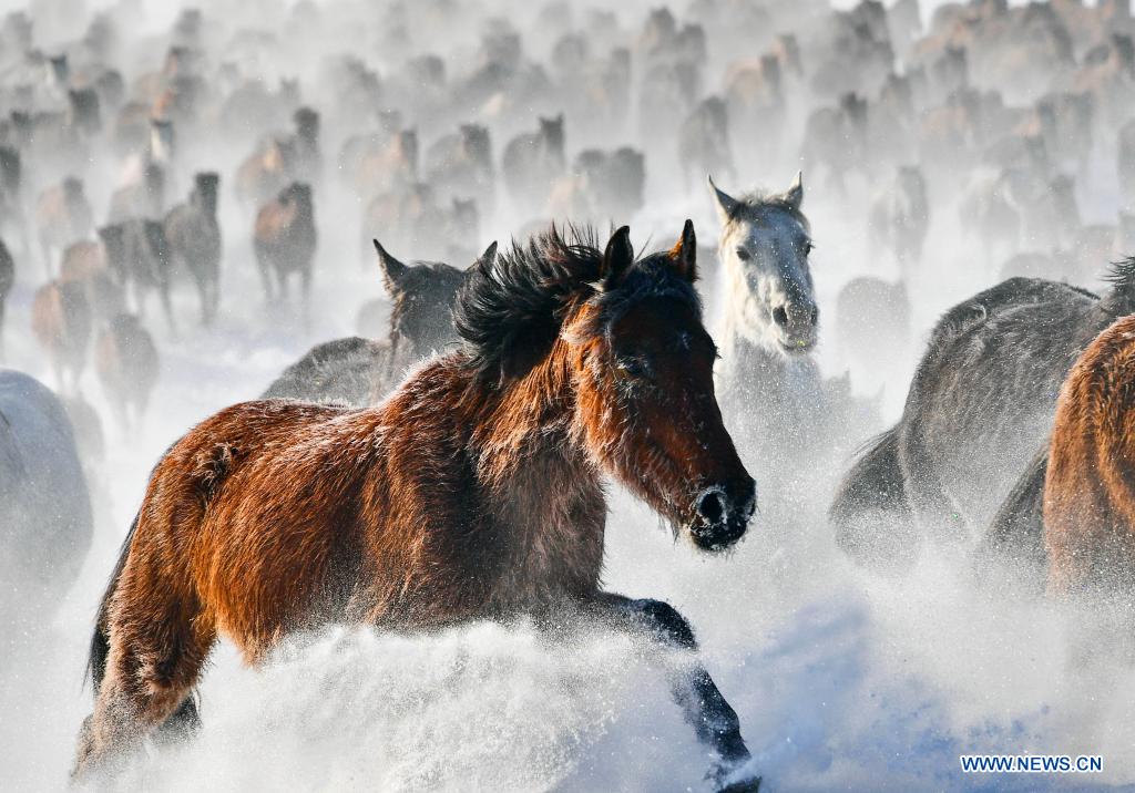 Des chevaux galopent sur un champ de neige dans le district de Zhaosu de la région autonome ouïgoure du Xinjiang, dans le nord-ouest de la Chine, le 20 décembre 2021. (Xinhua/Li Wenwu)