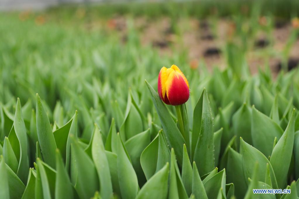 Photo prise le 21 janvier 2022 montrant une tulipe dans une ferme de fleurs à Lisse, aux Pays-Bas. (Xinhua/Zheng Huansong)