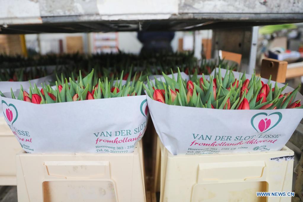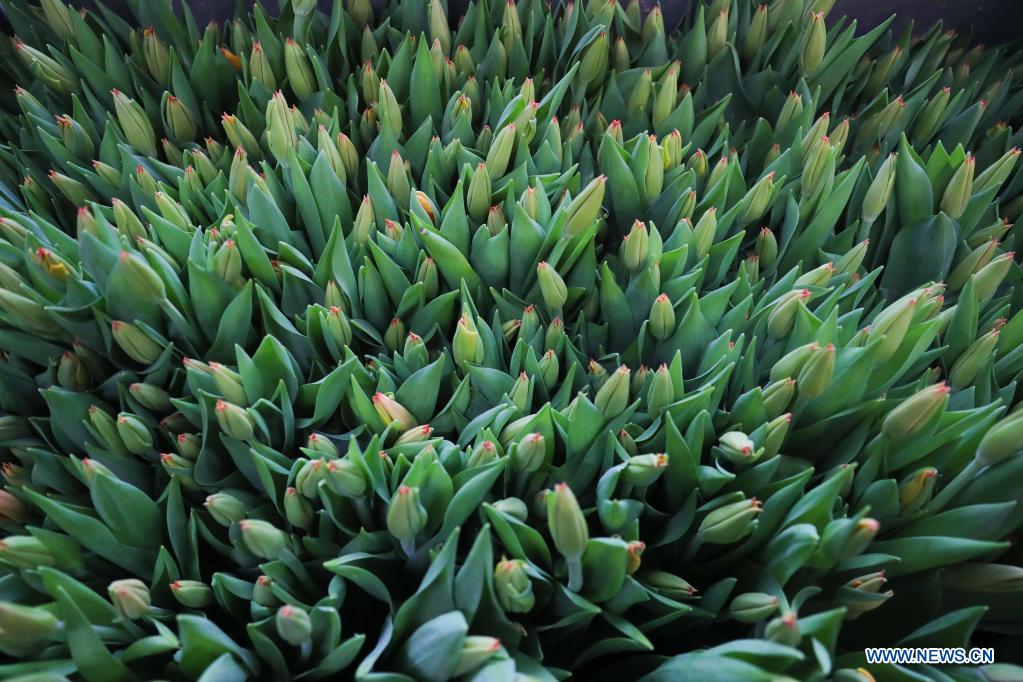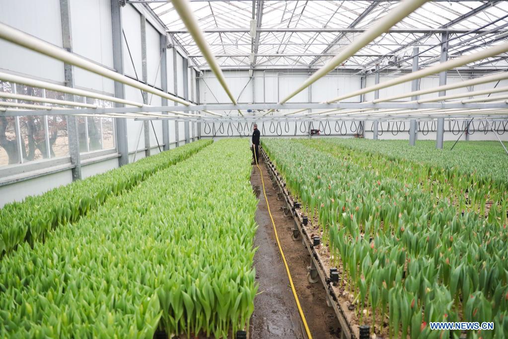 Photo prise le 21 janvier 2022 montrant des tulipes dans une ferme de fleurs à Lisse, aux Pays-Bas. (Xinhua/Zheng Huansong)