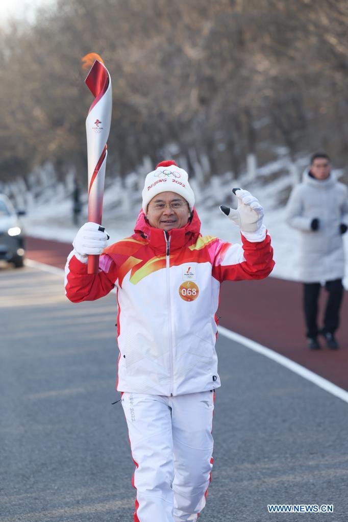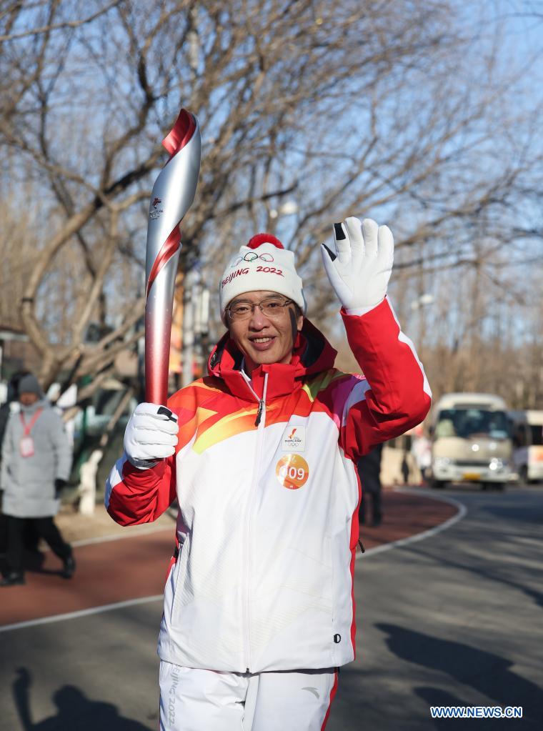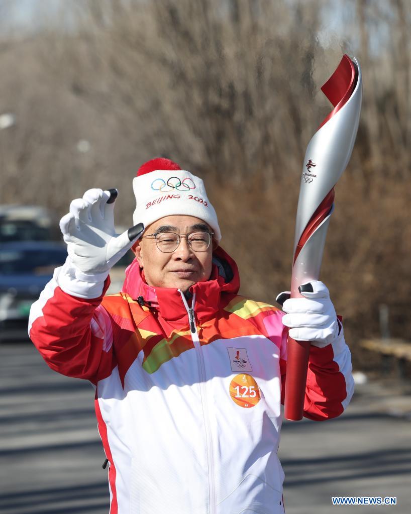 BEIJING, 2 février (Xinhua) -- Zhang Boli lors du relais de la flamme olympique, dans le Parc forestier olympique de Beijing, le 2 février 2022. (Photo : Jia Haocheng)