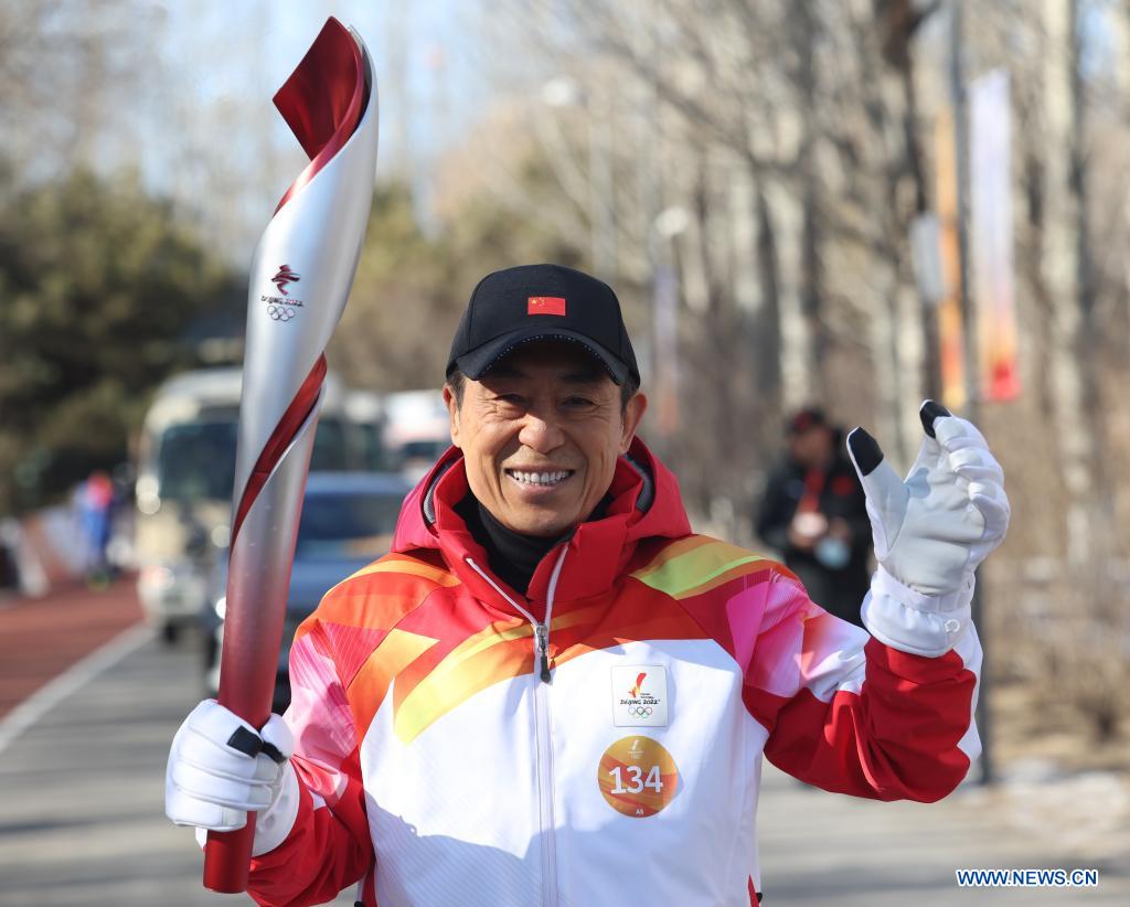 BEIJING, 2 février (Xinhua) -- Zhang Yimou lors du relais de la flamme olympique, dans le Parc forestier olympique de Beijing, le 2 février 2022. (Photo : Jia Haocheng)