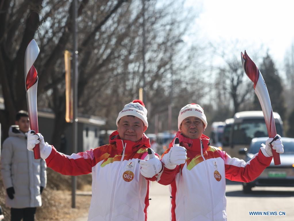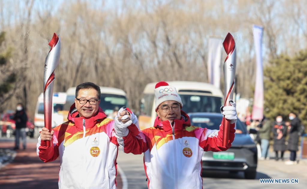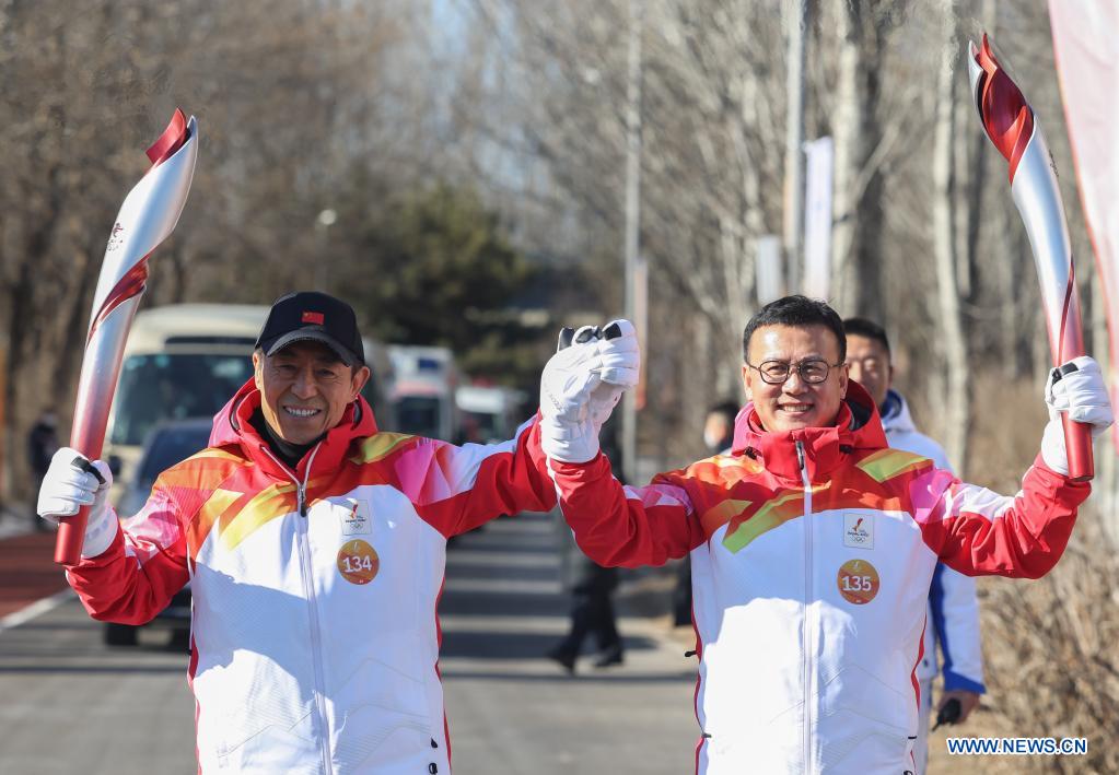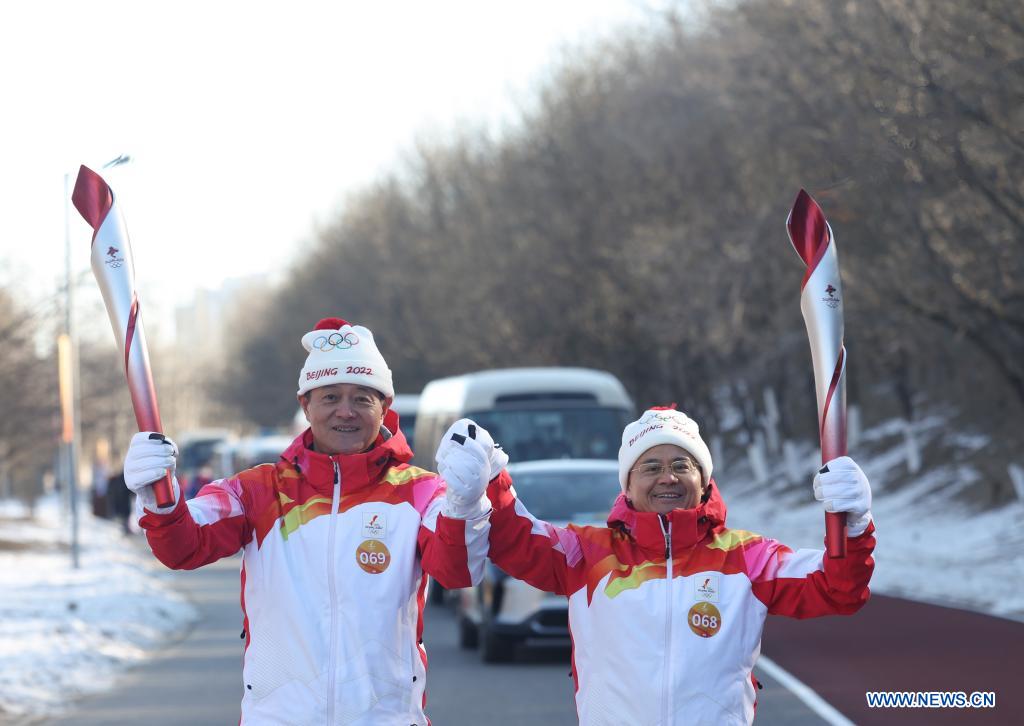 BEIJING, 2 février (Xinhua) -- Zhang Boli (à droite) et Tong Zhaohui lors du relais de la flamme olympique, dans le Parc forestier olympique de Beijing, le 2 février 2022. (Photo : Jia Haocheng)