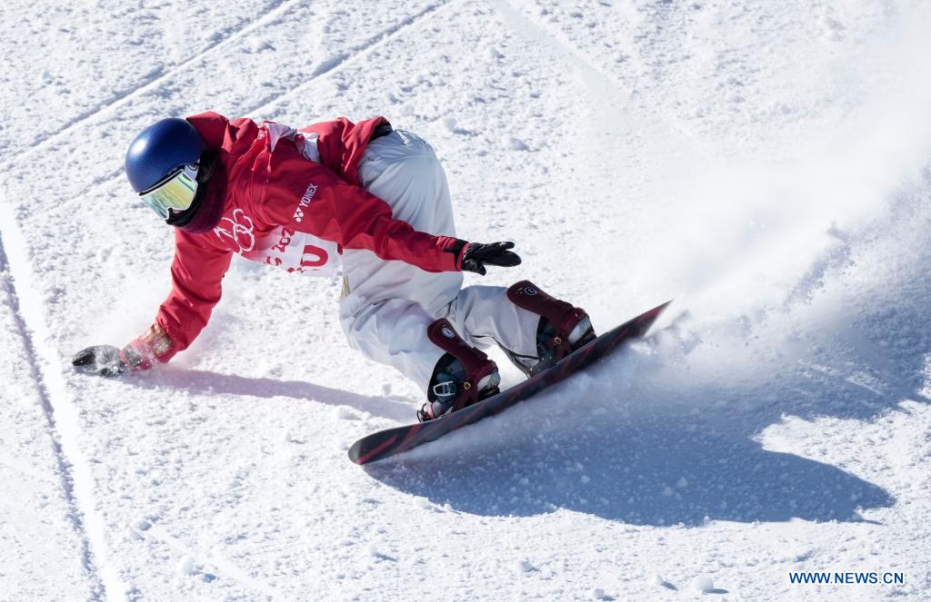 ZHANGJIAKOU, 5 février (Xinhua) -- Onitsuka Miyabi, du Japon, lors de la qualification du snowboard slopestyle femmes au parc à neige de Genting à Zhangjiakou, dans la province chinoise du Hebei (nord), le 5 février 2022. (Photo : Xue Yubin)