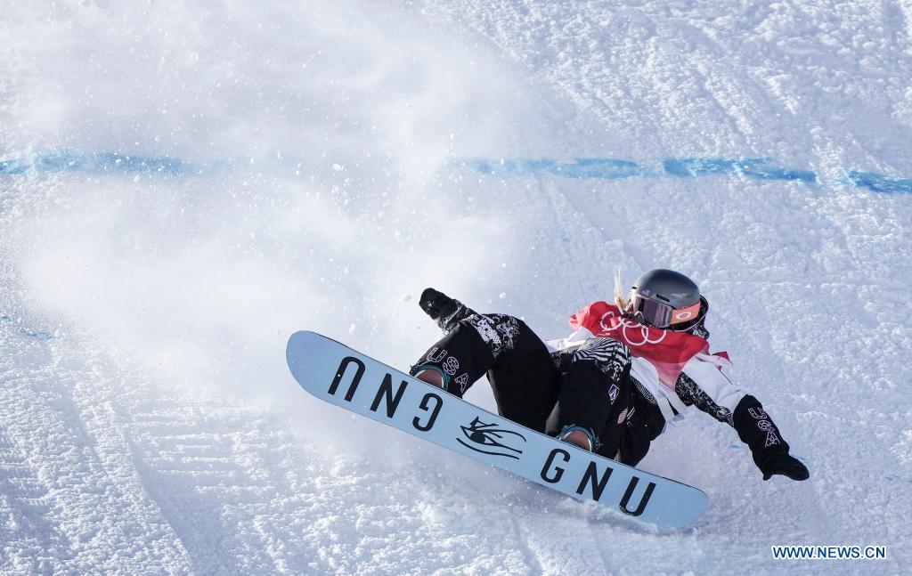 ZHANGJIAKOU, 5 février (Xinhua) -- Jamie Anderson, des Etats-Unis, lors de la qualification du snowboard slopestyle femmes au parc à neige de Genting à Zhangjiakou, dans la province chinoise du Hebei (nord), le 5 février 2022. (Photo : Xue Yubin)