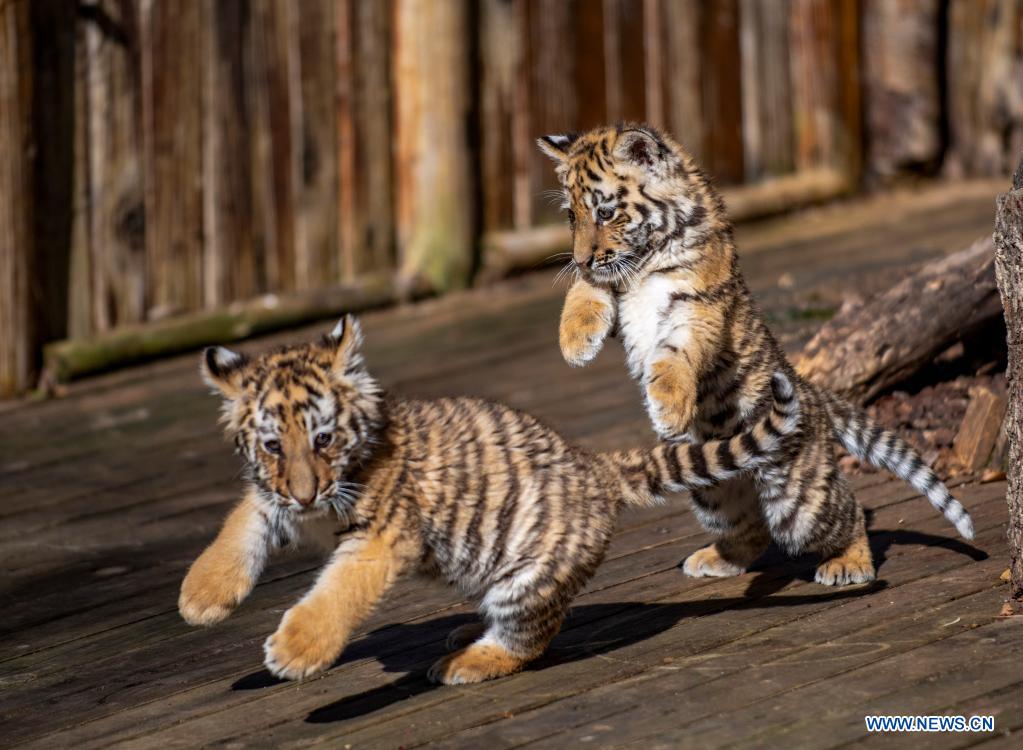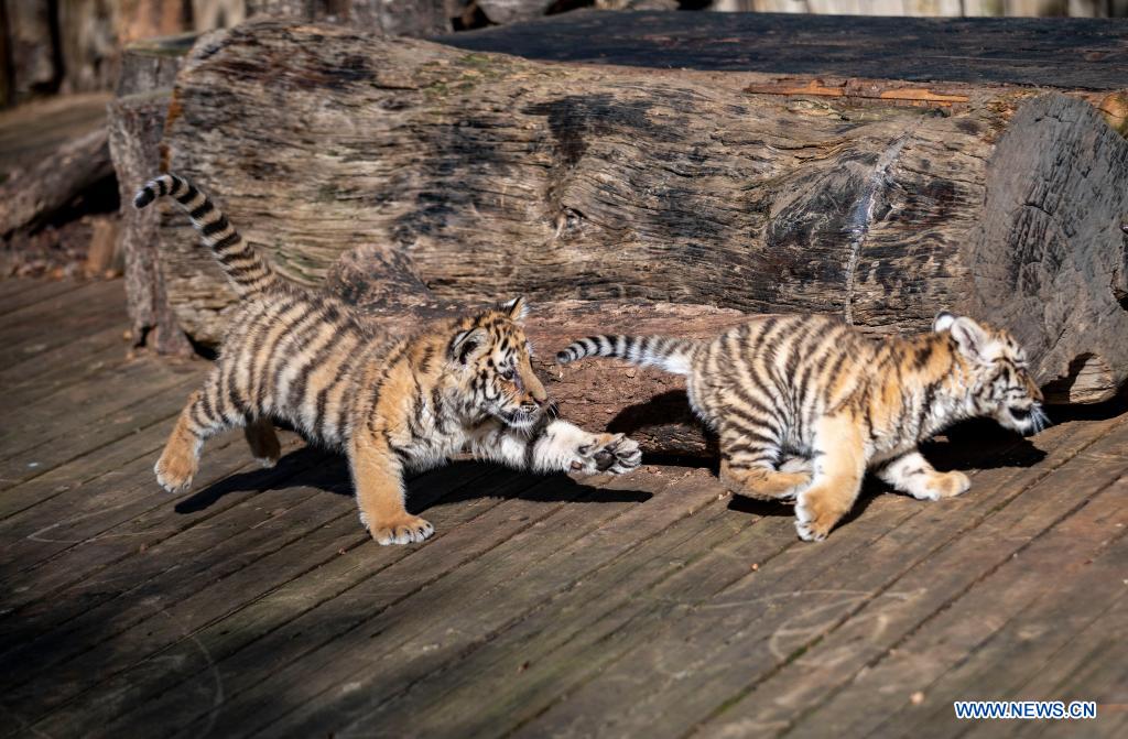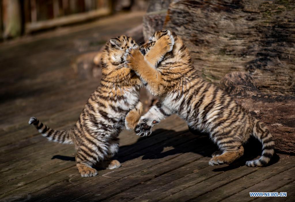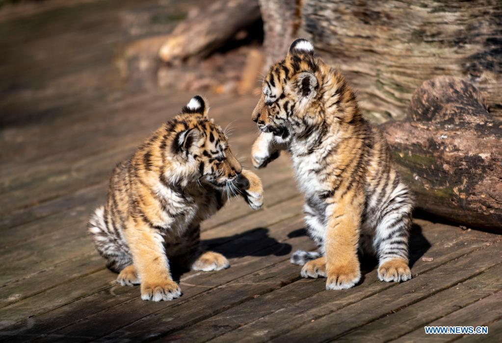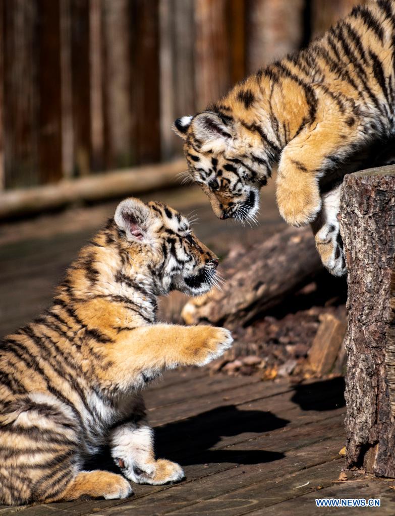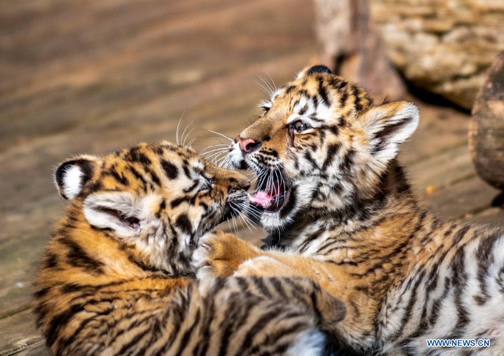 Deux bébés tigres de Sibérie s'amusent au Parc des animaux sauvages de Yunnan à Kunming, dans la province chinoise du Yunnan (sud-ouest), le 30 janvier 2022. (Xinhua/Chen Xinbo)