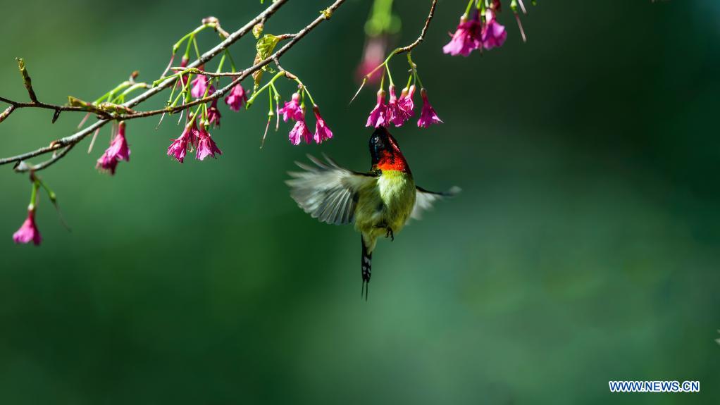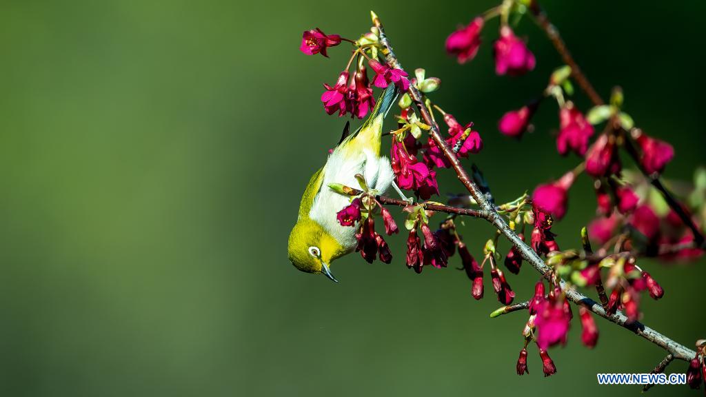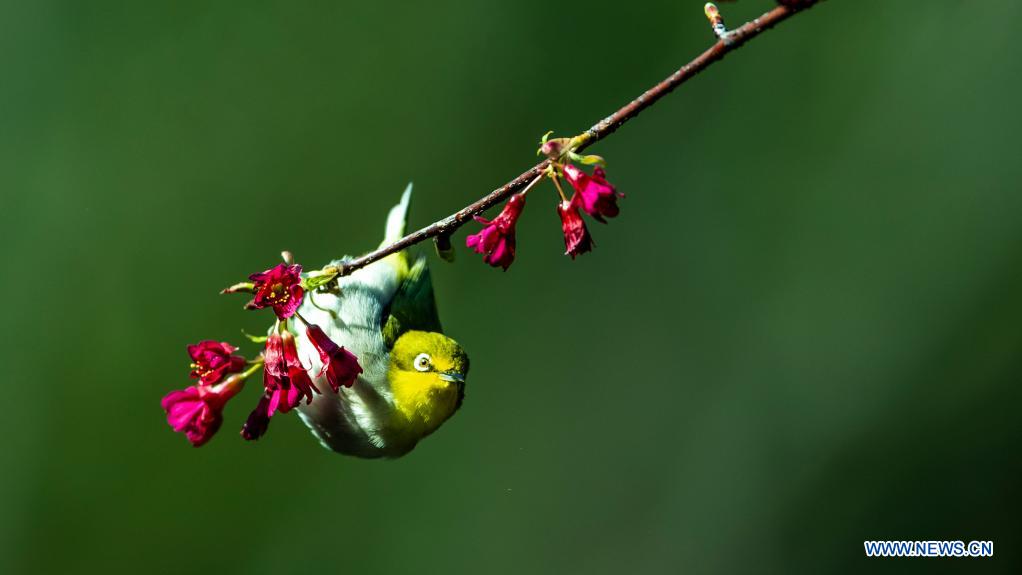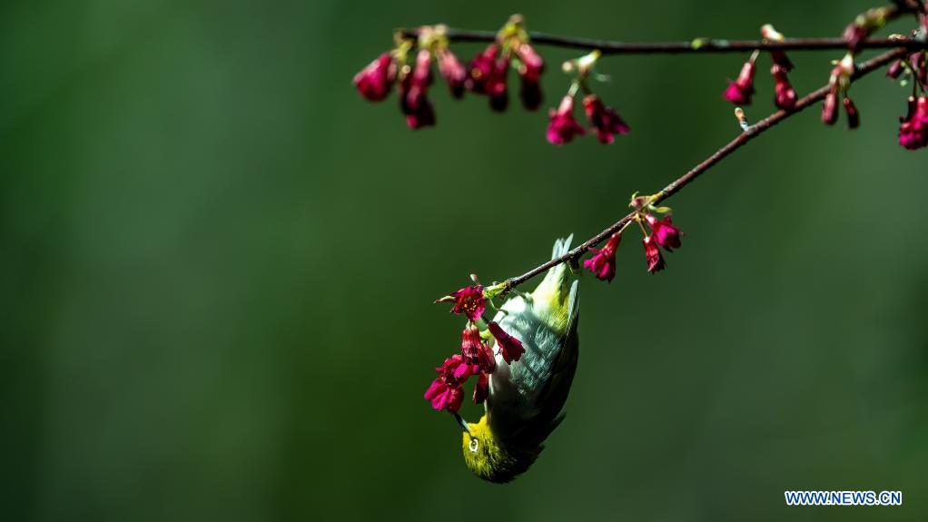 FUZHOU, 26 février (Xinhua) -- Un oiseau suce le nectar d'une fleur de cerisier à Fuzhou, capitale de la province chinoise du Fujian (sud-est), le 24 février 2022. (Photo : Mei Yongcun)