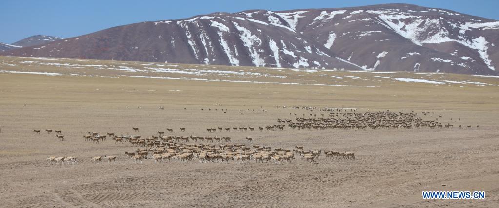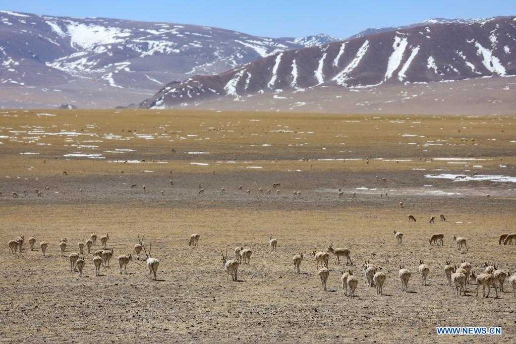 GERZE, 1er avril (Xinhua) -- Des antilopes tibétaines dans le district de Gerze de la préfecture d'Ali, dans la région autonome du Tibet (sud-ouest de la Chine), le 27 mars 2022. Près de 10.000 antilopes tibétaines se sont rassemblées à Gerze, un événement rare qui serait lié à l'amélioration de la biodiversité et aux efforts de protection. (Photo : Penba)