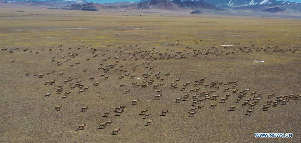 GERZE, 1er avril (Xinhua) -- Des antilopes tibétaines dans le district de Gerze de la préfecture d'Ali, dans la région autonome du Tibet (sud-ouest de la Chine), le 27 mars 2022. Près de 10.000 antilopes tibétaines se sont rassemblées à Gerze, un événement rare qui serait lié à l'amélioration de la biodiversité et aux efforts de protection. (Photo : Sonam Rinqen)