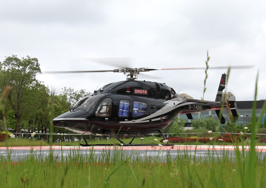 Un hélicoptère transportant du matériel médical s'apprête à décoller dans l'arrondissement de Songjiang, à Shanghai, le 24 avril 2022. (Photo : Chen Jianli)