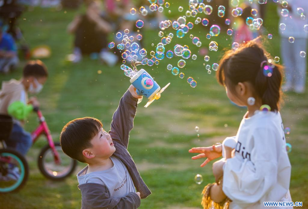Des enfants jouent dans un parc à Huaibei, dans la province chinoise de l'Anhui (est), le 3 mai 2022, le quatrième jour des vacances de la fête du Travail. (Xinhua/Wang Wen)