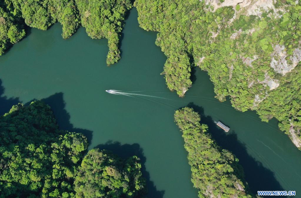 Des touristes font une excursion en bateau dans une zone pittoresque à Zhangjiajie, dans la province chinoise du Hunan (centre), le 3 mai 2022, le quatrième jour des vacances de la fête du Travail. (Xinhua/Wu Yongbing)