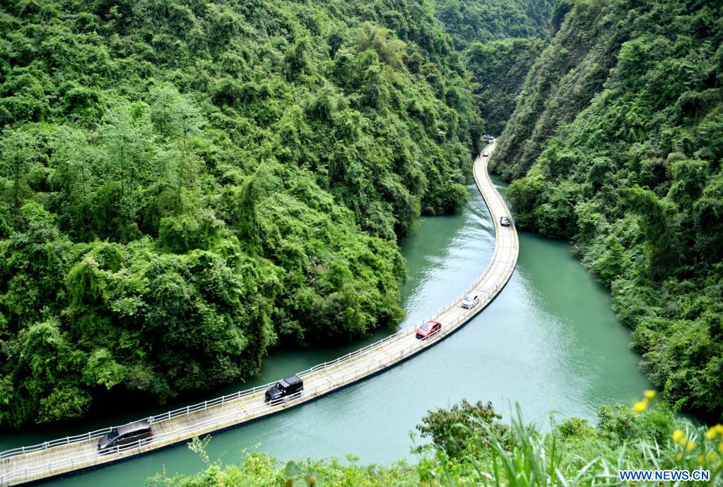 Des touristes traversent un pont dans une zone pittoresque à Enshi, dans la province chinoise du Hubei (centre), le 3 mai 2022, le quatrième jour des vacances de la fête du Travail. (Xinhua/Song Wen)