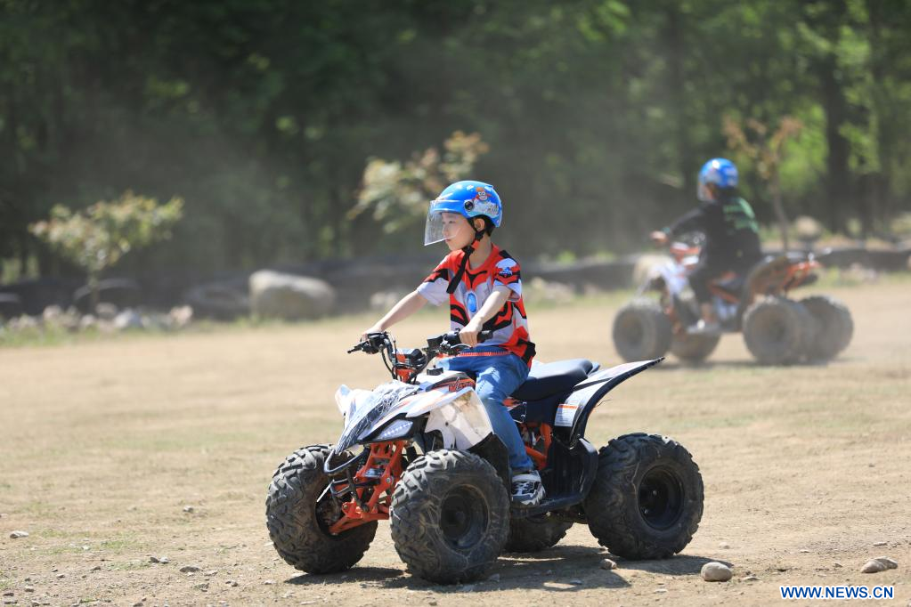 Un garçon conduit un karting dans une zone pittoresque de Hangzhou, dans la province du Zhejiang (est de la Chine), le 3 mai 2022, le quatrième jour des vacances de la fête du Travail. (Xinhua/Hu Jianhuan)