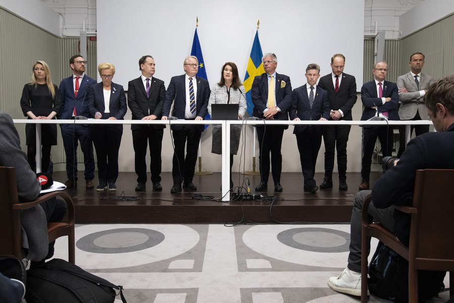 La ministre suédoise des Affaires étrangères Ann Linde (6e à gauche) et le ministre suédois de la Défense Peter Hultqvist (5e à gauche) participent à une conférence de presse organisée le 13 mai 2022 à Stockholm, en Suède. (Ninni Andersson/Bureaux du gouvernement suédois via Xinhua).