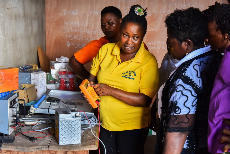 Eposi Njoh Monyengi présente les outils utilisés pour installer des panneaux solaires à des femmes dans son atelier à Tiko, au Cameroun, le 24 mai 2022. (Kepseu/Xinhua)