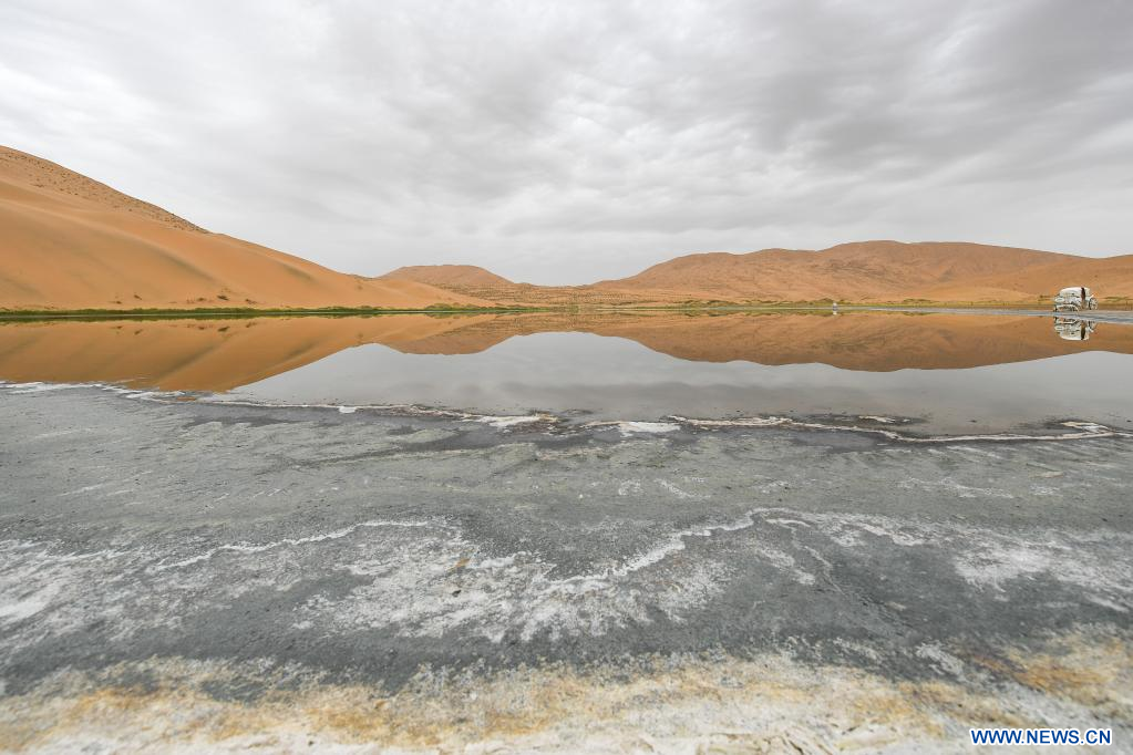 Vue d'un lac dans le désert de Badain Jaran dans la région autonome de Mongolie intérieure (nord de la Chine), le 13 juillet 2022. (Xinhua/Bei He)