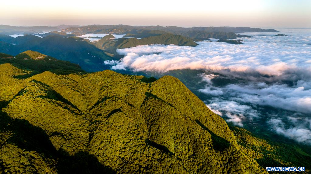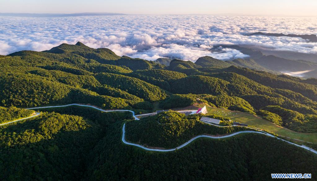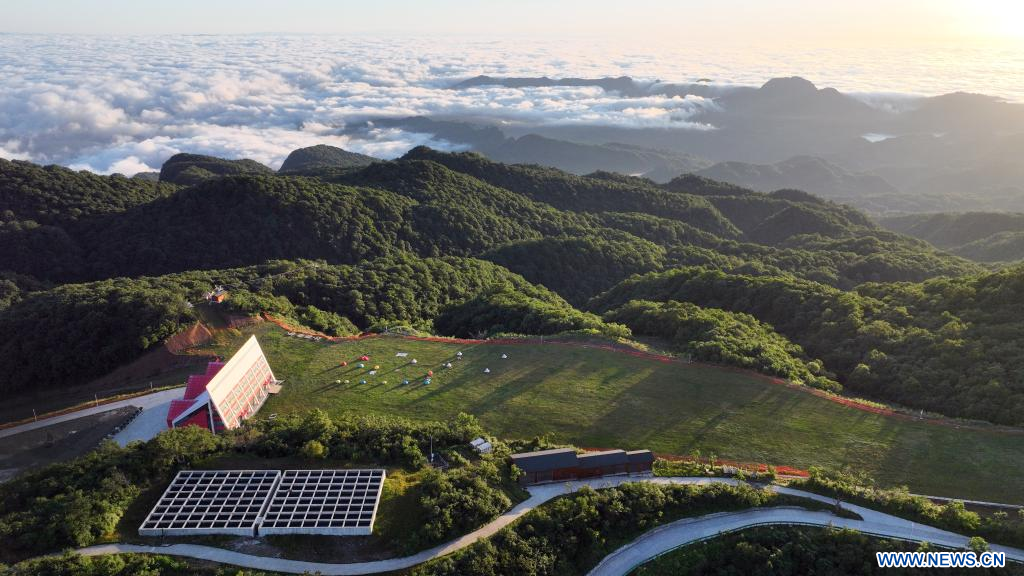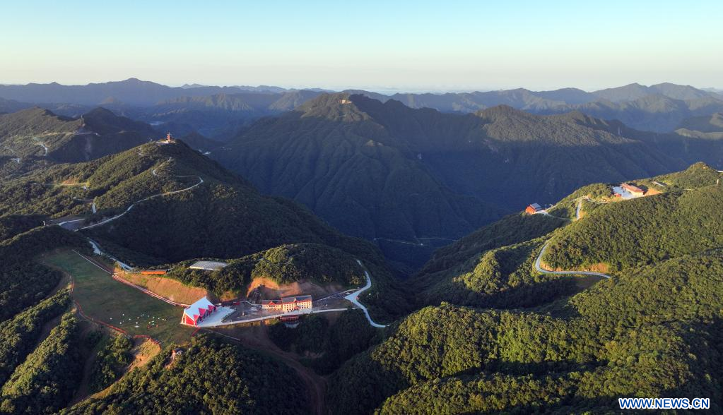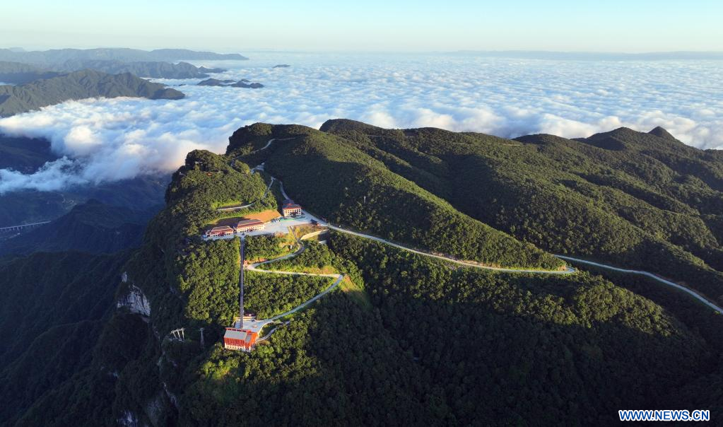 HANZHONG, 24 juillet (Xinhua) -- Photo aérienne du paysage de la zone touristique de Longtoushan à Hanzhong, dans la province chinoise du Shaanxi (nord-ouest), le 23 juillet 2022. (Photo : Tao Ming)