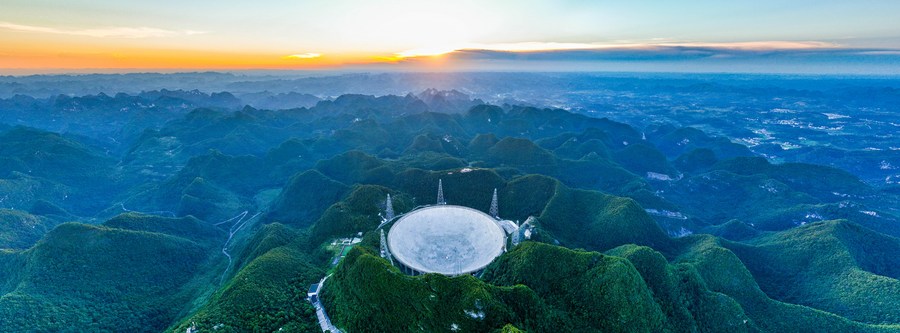Photo aérienne du radiotélescope sphérique de 500 mètres d'ouverture (Five-hundred-meter Aperture Spherical Radio Telescope, FAST) de la Chine en maintenance dans la province chinoise du Guizhou (sud-ouest), le 25 juillet 2022. (Photo : Ou Dongqu)■
