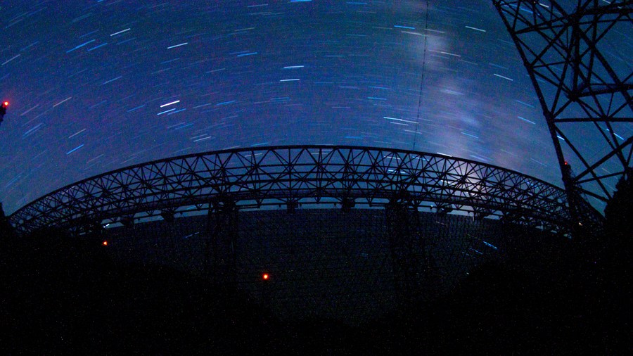 Photo à longue exposition du radiotélescope sphérique de 500 mètres d'ouverture (Five-hundred-meter Aperture Spherical Radio Telescope, FAST) de la Chine en maintenance dans la province chinoise du Guizhou (sud-ouest), le 25 juillet 2022. (Photo : Ou Dongqu)