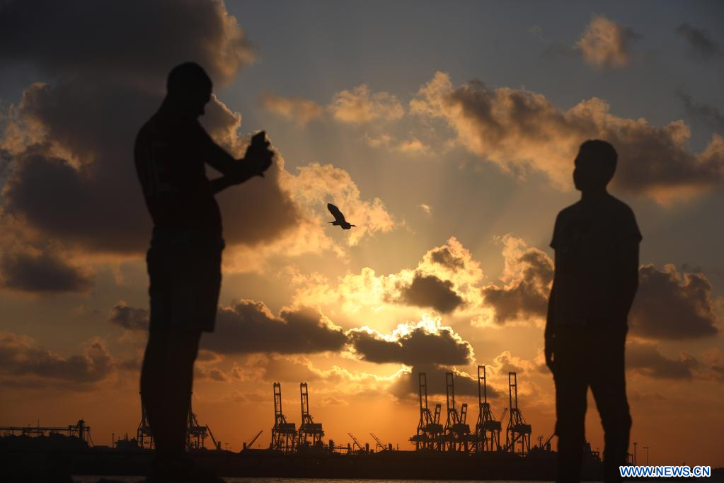 ALEXANDRIE (Egypte), 13 août (Xinhua) -- Photo prise le 13 août 2022 montrant le coucher du soleil au port d'Alexandrie, en Egypte. (Xinhua/Ahmed Gomaa)