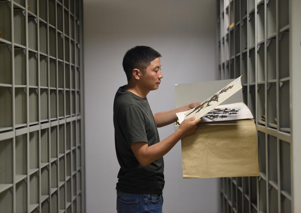 CHENGDU, 23 août (Xinhua) -- Photo prise le 17 août 2022 montre le chercheur Hu Jun vérifiant des spécimens à l'Institut de biologie de Chengdu relevant de l'Académie chinoise des Sciences dans la province du Sichuan dans le sud-ouest de la Chine.