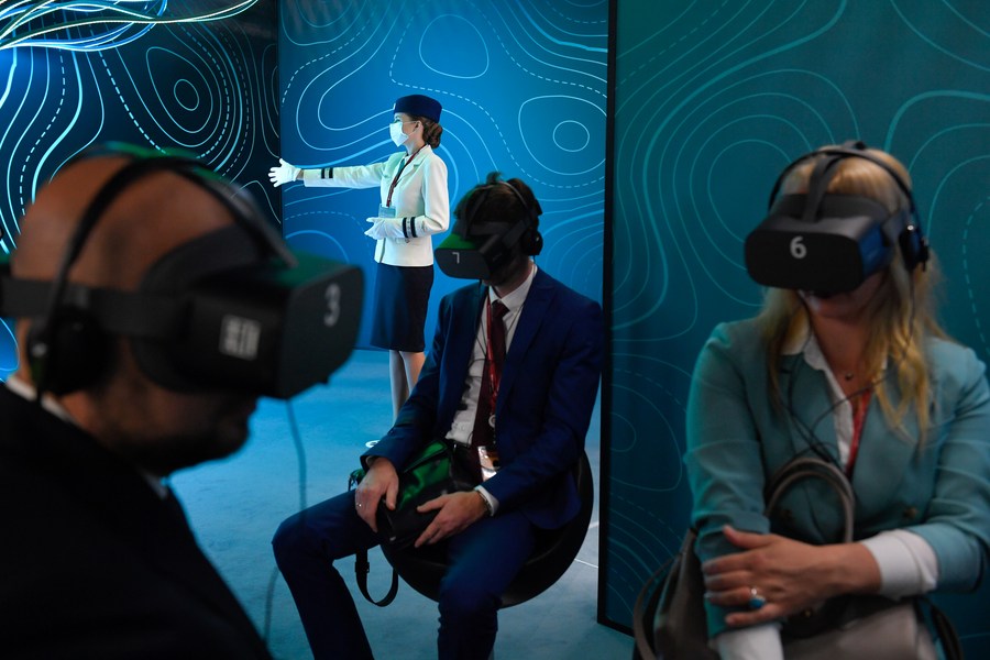 Interactions à travers des casques de réalité virtuelle lors du 7e Forum économique de l'Est (EEF) à Vladivostok, en Russie, le 5 septembre 2022. (Xinhua/Alexander Zemlianichenko Jr)
