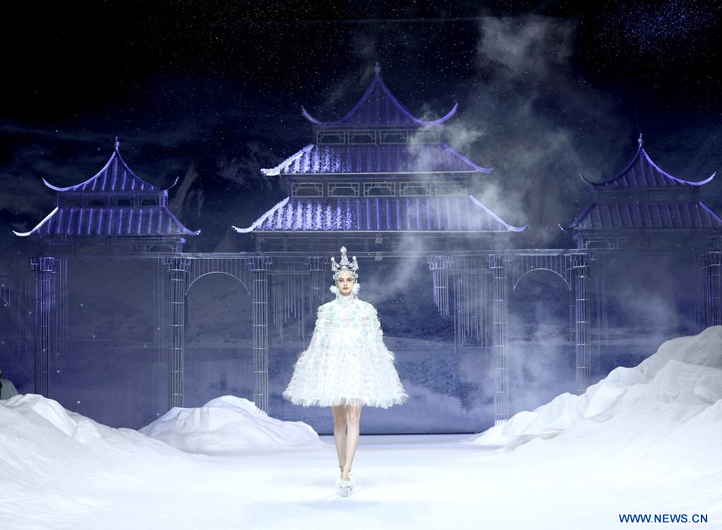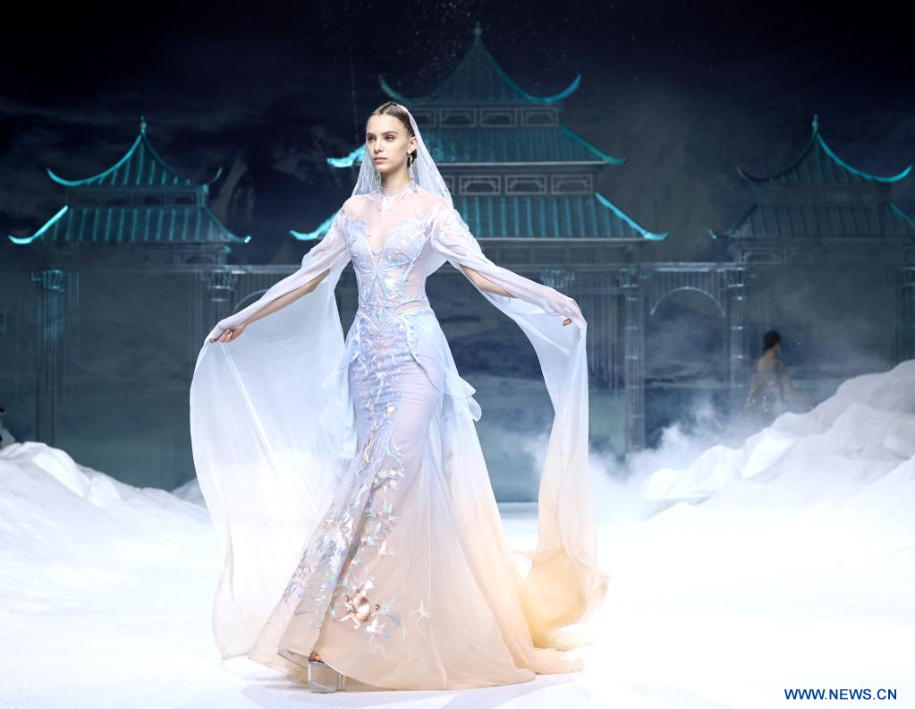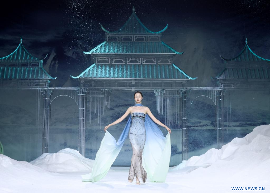BEIJING, 5 septembre (Xinhua) -- Un mannequin présente une création de la styliste Xiong Ying au défilé d'ouverture de la Semaine de la mode de Chine printemps/été 2023, à Beijing, capitale chinoise, le 4 septembre 2022. La semaine de la mode s'est ouverte dimanche à Beijing. (Photo : Chen Jianli)